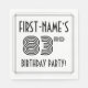 El diseño de la servilleta de papel inspirado en el estilo de los años 20-30, de 83 años, incluye un nombre editable, un lujoso estilo Art Déco inspirado en el número "83", el mensaje "¡PARTIDO DE CUMPLEAÑOS!" y un borde multilínea. Las servilletas de papel como estas podrían ser usadas en un fiesta realizado en celebración del cumpleaños ochenta y tres de alguien. [~Z0000613]