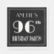 Este elegante diseño de servilletas de papel inspirado en el estilo de los años 20-30, inspirado en la celebración de 96 años, presenta un nombre de personalizable, un elegante estilo Art Decó inspirado en el número "96", el mensaje "¡FIESTA DE CUMPLEAÑOS!" y un patrón fronterizo compuesto de líneas. Hay un fondo de color negro de forma predeterminada, pero se puede personalizar a un color diferente, si se desea. Las servilletas de papel como estas pueden ser usadas cuando se celebra el 96º cumpleaños de alguien. [~Z0000612]