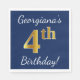 Este diseño de servilleta de papel simple presenta un mensaje como "¡El 4º cumpleaños de Georgiana!", con el "4º" teniendo una apariencia similar al oro falso, sobre un fondo de color azul. El nombre se puede personalizar. Se podría utilizar en una fiesta de cumpleaños para alguien que está celebrando su cuarto cumpleaños.
