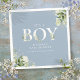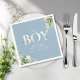 Es una servilleta de baby shower de niño con tipografía elegante y hermoso follaje botánico en un fondo azul polvoriento. Diseñado por Thisisnotme©