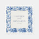 Celebrate your union with elegance and serenity through our “Azure Blooms” collection—where vibrant blue toile patterns meet refined design to bring your wedding vision to life. This collection features an elegant style with a cohesive blue toile floral theme, perfect for weddings. The artwork is characterized by intricate botanical designs in varying shades of blue and white, creating a sophisticated and timeless look. Recurring motifs include lush flowers and foliage, which adorn various items such as invitations, tableware, wine labels, menus, and thank you cards. These elements are meticulously arranged to evoke a sense of romance and refinement. The versatility of the design allows it to be applied across multiple product types, ensuring a harmonious aesthetic throughout the wedding celebration.