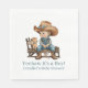 ¡Sí, es un niño! Las servilletas de papel de ducha de temática occidental, con adorables gráficos de un niño vaquero sentado en un banco de madera. Personalice el texto azul para adaptarlo a sus necesidades de eventos.