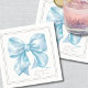 Un encantador diseño de servilleta para cóctel que presenta un gran lazo azul de acuarela en el centro. El nombre de la futura mamá se muestra en una fuente serif clásica, con "Baby Shower" escrito elegantemente debajo en caligrafía manuscrita. Alrededor de los bordes de la servilleta hay un sutil marco de doble línea en gris suave, que agrega un toque de sofisticación y equilibrio al diseño.