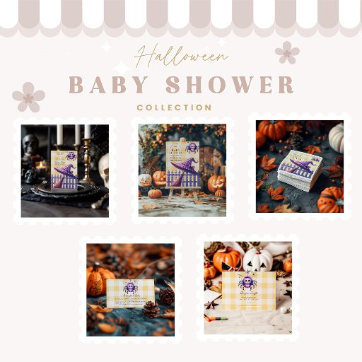 ¡Celebra tu pequeño libro con este encantador diseño de ducha de bebé de Halloween! Con un acogedor fondo de gingham, un gorra de brujas morado, una escoba de madera y una araña con un arco que cuelga sobre una valla de piquete, esta invitación mezcla fantasía y dulzura en todos los sentidos correctos. Perfecto para un caprichoso fiesta otoñal lleno de calidez y magia.