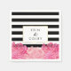 Una hermosa elección para fiestas de compromiso, duchas de novias y bodas, estas elegantes servilletas rayadas en blanco y negro con tus nombres o texto de elección dentro de una falsa caja dorada bordeada, con un trío de peonías rosadas pálidas y brillantes floreciendo a lo largo del fondo.