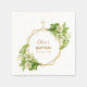 Esta elegante servilleta de papel floral para bautizo recomendada para el bautizo de una niña, tiene un marco dorado geométrico irregular con ramos de flores de lirios blancos hacia arriba y hacia abajo sobre dos hexágonos dorados que se superponen, con una cruz dorada en la parte superior. El nombre del niño está escrito en una elegante letra caligráfica; el resto está escrito en letras mayúsculas más pequeñas. Todo el texto tiene un color amarillo dorado, como el marco dorado. El ramo de flores vintage con lirios blancos es de una postal antigua de Bertha Maguire (1862-1910), ahora en el dominio público.
