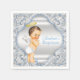 Servilletas de bautizo de niño con un adorable bebé angelito en un hermoso fondo azul y plateado con remolinos. Puedes personalizar con el texto de tu elección.
