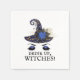 Las servilletas ideales para tu fiesta de Halloween o despedida de soltera con tema de Halloween. Cuenta con una cara de bruja linda (un sombrero de bruja azul con lunas y estrellas doradas y un ramo azul, negro y dorado sobre unas cejas arqueadas y párpados maquillados con brillo azul). A continuación, el texto negro dice "¡Beban, brujas!" en una fuente adecuadamente espeluznante.