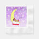 Pequeña y dulce personalizado, dibujada a mano, bebé con ganchos rojos y pañuelos para la cabeza durmiendo tranquilamente en la luna rodeada de corazones y estrellas con un fondo morado. Esta pequeña niña tiene la piel y el pelo más oscuros para representar diferentes razas como la hispana o la afroamericana.