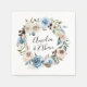 Nuestras elegantes toallas de papel personalizadas cuentan con una corona floral de rosas de color blanco y azul índigo con hojas verdes mutadas. Personalice las servilletas añadiendo sus nombres para un diseño que impresionará a sus huéspedes. Diseñado para coordinar con nuestra colección de bodas de Belleza Blooming.