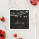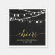Agrega un detalle elegante a tu día especial con esta servilleta personalizada para fiesta. Este diseño presenta luces de cadena modernas y tipografía " Cheers" en tema de colores dorado y negro. Invitaciones de cumpleaños y suministros para fiestas a juego están disponibles en mi tienda BaraBomDesign.