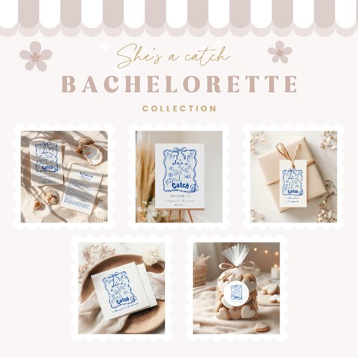 Celebrate the bride-to-be with this playful Shes a Catch bachelorette design, featuring coastal doodles, a wavy coquette-style frame, and a bold blue bow. With shells, bikinis, martinis, and sunshine vibes, it’s perfect for a beachside bash, tropical pool party, or girls’ weekend getaway. Editable for any bachelorette celebration — from classy to cheeky!
