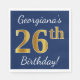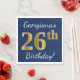 Este sencillo diseño de servilletas de papel muestra un mensaje como "¡Cumpleaños 26 de Georgiana!", con el "26" en una falsa apariencia dorada, en un fondo de color azul. El nombre se puede personalizar. Podría ser usado en una fiesta de cumpleaños para alguien que está celebrando su 26º cumpleaños. [~Z0000083]