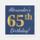 Este sencillo diseño de servilletas de papel muestra un mensaje como "¡El cumpleaños número 65 de Alexander!", con el "65" en apariencia de oro falso, sobre un fondo de color azul. El nombre se puede personalizar. Se podría usar en una fiesta de cumpleaños para alguien que esté celebrando su sexagésimo quinto cumpleaños. [~Z0000083]