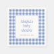 Un patrón clásico de chequeo de gingham azul enmarca un rectángulo blanco con esquinas redondeadas y un delgado borde azul, con el nombre de la futura madre y las palabras "baby ducha" en una tipografía encantadora de color azul. Agregue la fecha siguiente en el tipo de letra gris sans serif. Ideal para la ducha de bebé de un niño.