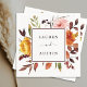 Esta servilleta boda tiene flores color agua amarillo, rosa rubor, naranja, y hojas verdes, burdeos y marrones con un marco cuadrado. Es perfecto para un boda de otoño o eventos similares.
