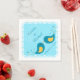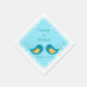 Esta es una servilleta de papel de boda o ducha de novia, con dos pájaros amorosos verde azulados azules y mandarinos sobre un fondo de imagen de encaje azul más claro de bonito. Sobre los dos pájaros hay una imagen blanca de corazón girado. El texto del personalizable está verde azulado a una coincidencia más oscura. ¡Luminoso y colorido!
