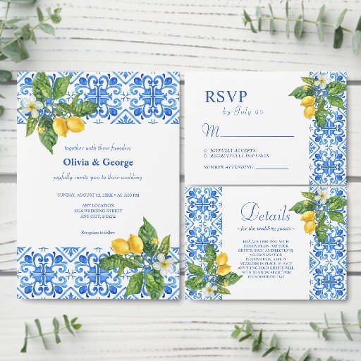 Servilleta De Papel Boda de azulejos azules y limones mediterráneos