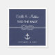 Tema náutico moderno de ancla y cuerda atada superpuesta en azul marino con tipografía moderna y script en servilletas de papel para bodas.