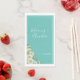 toallas de invitado de papel boda con acuarela color blanco esquina sobre fondo verde azulado claro con bloques de texto de personalizable blanco en fuentes modernas