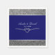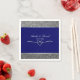 Servilletas de boda elegantes con un rico fondo azul real enmarcado con acentos de brillo plateado falso y terminadas con un delicado diseño de monograma de corazón de cuerda plateada. Estas servilletas personalizadas son ideales para bodas formales, nocturnas, de invierno y de lujo clásicas, añadiendo profundidad, contraste y sofisticación a la decoración de su mesa.