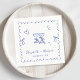 Toallas de boda de diseño de inspiración retro para tu fiesta de compromiso, cena de ensayo, recepción de bodas, etc., con un marco ondulado de color azul francés adornado con arcos de coqueta, ilustraciones caprichosos de corazón dibujados a mano, estrellas y copas de vino, y los nombres de la novia y el novio con un libreto azul.
