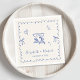Toallas modernas de boda crema de inspiración retro para tu fiesta de compromiso, cena de ensayo, recepción, etc., con un marco ondulado azul adornado con arcos de coqueta, ilustraciones caprichosos de un corazón dibujados a mano, estrellas y copas de vino, y los nombres de la novia y el novio en un librito azul lúdico.