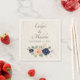 Estas servilletas personalizadas son perfectas para su boda en un ambiente rústico. Presentan un fondo de madera blanca de color claro y acentos florales en azul marino y melocotón suave o rosa rubor representando peonías y rosas con acentos folláricos verdes. El diseño moderno de la tipografía es un conjunto de tonos verdes oscuros para un ambiente romántico y acogedor.