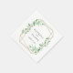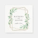 Elegante marco geométrico dorado adornado con vegetación de acuarela, servilletas de papel personalizadas. El diseño presenta líneas de texto de plantilla para nombres y fecha.