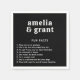 Las servilletas bodas de estilo moderno presentan un diseño sencillo y mínimo con sus nombres en un tipo de letra retro groovy junto con una lista de hechos divertidos sobre la novia y el novio. El esquema de color es negro con letras blancas. Las fuentes / colores pueden cambiarse en la herramienta de edición de diseño. Estas divertidas toallas de datos le dan un elemento divertido a la recepción de tu boda, la fiesta de compromiso o la ducha de novia.