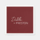 Modernas toallas de boda burdeos con un diseño sencillo y mínimo, con el nombre de la novia en un guión elegante y el nombre del novio en una fuente contemporánea sans serif. Estas servilletas de estilo minimalista son una gran incorporación a la recepción de bodas, la fiesta de compromiso o la ducha de novia.