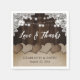 Decore su rústico campo, patio trasero o fiesta de bodas con estas servilletas de papel casero a medida con corazones de burrega contra una burrega y fondo rústico de madera adornado con luces de cuerda y encaje floral blanco.