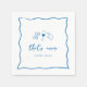 Este hermoso diseño de despedida de soltera inspirado en Italia presenta letras cursivas de estilo escrito a mano acentuadas con un borde de cinta ondulada en azul soleado. Ilustraciones dibujadas a mano de pasta de moño, vino y un limón siciliano completan el diseño para un look veraniego de la Costa Amalfitana. Estas elegantes servilletas de despedida de soltera mediterráneas presentan "that's amore" en letra manuscrita con los nombres de la pareja debajo.
