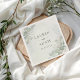 Elegant boho wedding napkins feature romantic eucalyptus in a delicate shade of sage green and simple, stylish dark green typography script on a watercolour background, complemented by rustic sage green eucalyptus leaves. Customise with your unique details..