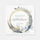 Este diseño de boho incluye las palabras "ducha de novia" en un elegante guión de escritura a mano índigo con flores al principio y al final, enmarcado por una corona de color azul índigo, pampas, flores blancas y un círculo de Relieve metalizado falso dorado. Personalice el texto con el nombre de la futura novia y la fecha de la ducha.