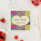 Un gráfico de forma de corazón de color crema con un borde de costilla falso se coloca sobre un fondo de edredón con retazos florales en estas servilletas de papel que tienen un aspecto cálido y colorido y son perfectas para los bodas de estilo boho. La forma del corazón está lista para ser personalizada con los nombres de la novia y el novio y su fecha boda.