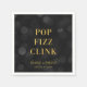 Servilleta elegante con las palabras "Pop Fizz Clink" en lámina dorada falsa sobre un fondo de luces bokeh gris oscuro. Perfecta para fiestas de compromiso, bodas, aniversarios u otros eventos.
