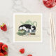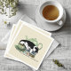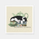 Un lindo gato de esmoquin blanco y negro durmiendo en un montón de libros con una tetera verde detrás y una taza de té delante