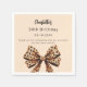 Un suave fondo beige. Decorada con un gran arco con estampado de leopardo. Personalice y agregue un nombre, edad, fecha y un texto. Guión de estilo manuscrito marrón.
