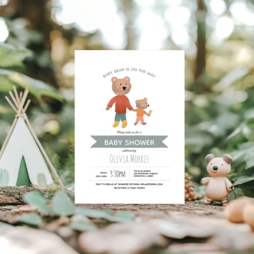 Este diseño de pañuelos para bebé, lindo y moderno, incluye un padre y un oso bebé. También hay espacio para que añada el nombre de la madre y la fecha de su fiesta de bosques.