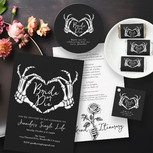 Set the tone for your unique celebration with our Bride or Die Skeleton Heart Bachelorette Party Napkins. This gothic design features a skeletal hand with elegant floral accents, perfect for ladies who embrace a darkly romantic aesthetic. These napkins not only convey your party details but also showcase your personality and style. Invite your closest friends to join in the celebration of love and friendship with a touch of gothic charm!