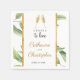 Este diseño de servilletas para fiesta de compromiso Brindis al Amor presenta dos copas de champán en un brindis por el amor. Hay un bonito marco dorado con acentos botánicos verdes que rodean el texto en la parte posterior y delantera de esta invitación de fiesta moderna y elegante. Personalice este accesorio de boda con sus nombres y la fecha de su evento.