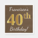 Este sencillo diseño de servilleta de papel muestra un mensaje como "¡Cumpleaños 40 de Francisco!", con el "40" en un falso aspecto dorado, en un fondo de color marrón. El nombre se puede personalizar. Se podría usar en una fiesta de cumpleaños para alguien que esté celebrando su cuadragésimo cumpleaños. [~Z0000082]