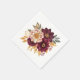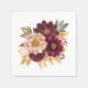 Party paper napkins are shown in the white cocktail size with an art print of a pretty burgundy and gold floral mix.