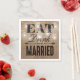 Estas llamativas servilletas de cena casamental de campo vienen como un conjunto boda a juego con un fondo rústico de efecto burregal marrón, elegantes luces de arrugas de cuerdas de jarro de masón y las palabras "COME, BEBE Y ESTÉ CASADO".