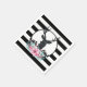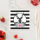 Piscinas de papel con la cabeza de ciervo negro con grandes cuernos. Las líneas geométricas dentro de la cara del ciervo agregan un toque creativo. Flores rosas y coloridas hojas verdes de menta forman un ramo floral de bonito bajo su cabeza. Un sketch de cordillera colocado entre las flores también le da un toque rústico al campo. El fondo es un patrón rayado en blanco y negro.