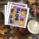 Gatos negros delgados entre calabazas, caramelos de halloween, murciélagos, escoba, estrellas, maíz dulce, bellotas, luna llena, hojas de otoño y un fantasma cortado todo puesto en un fondo morado claro