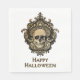 Estas servilletas de Halloween de la época Vintage presentan un marco ornamentado con un diseño de cráneo en el centro sobre un fondo de damasco marrón. Las palabras "Feliz Halloween" se escriben en un tipo de letra pirata.