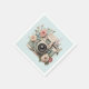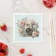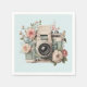 Paper napkins with a vintage styled camera decorated with flowers. Pastel colors of pink, cream and green.