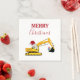 Un lindo ilustracion de una excavadora de juguetes amarillos con sombrero de Papá Noel y decorada con Navidades, ilumina algunos regalos de Navidades con palabras "Feliz Navidad". Perfecto para los amantes de los camiones de construcción de todas las edades. Una servilleta ideal para Navidades para los amantes de las excavadoras de camiones grandes o pequeños, chicas o niños.